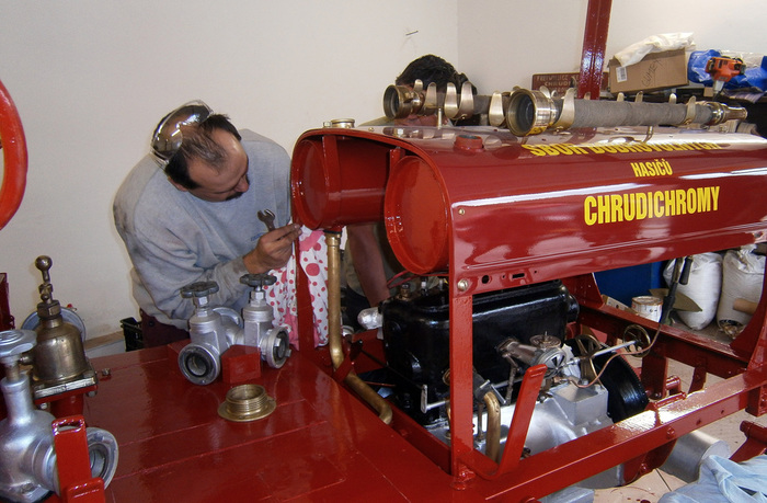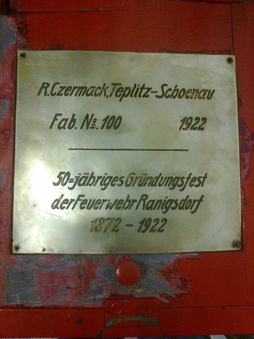 Během jara 2012 jsme zrenovovali naši nejstarší stříkačku. Zakoupenou do našeho sboru po 2. sv. válce. Teprve po odstranění velkých nánosů barvy byl objeven výrobní štítek. Výrobce: R.CZERMACK 1922.